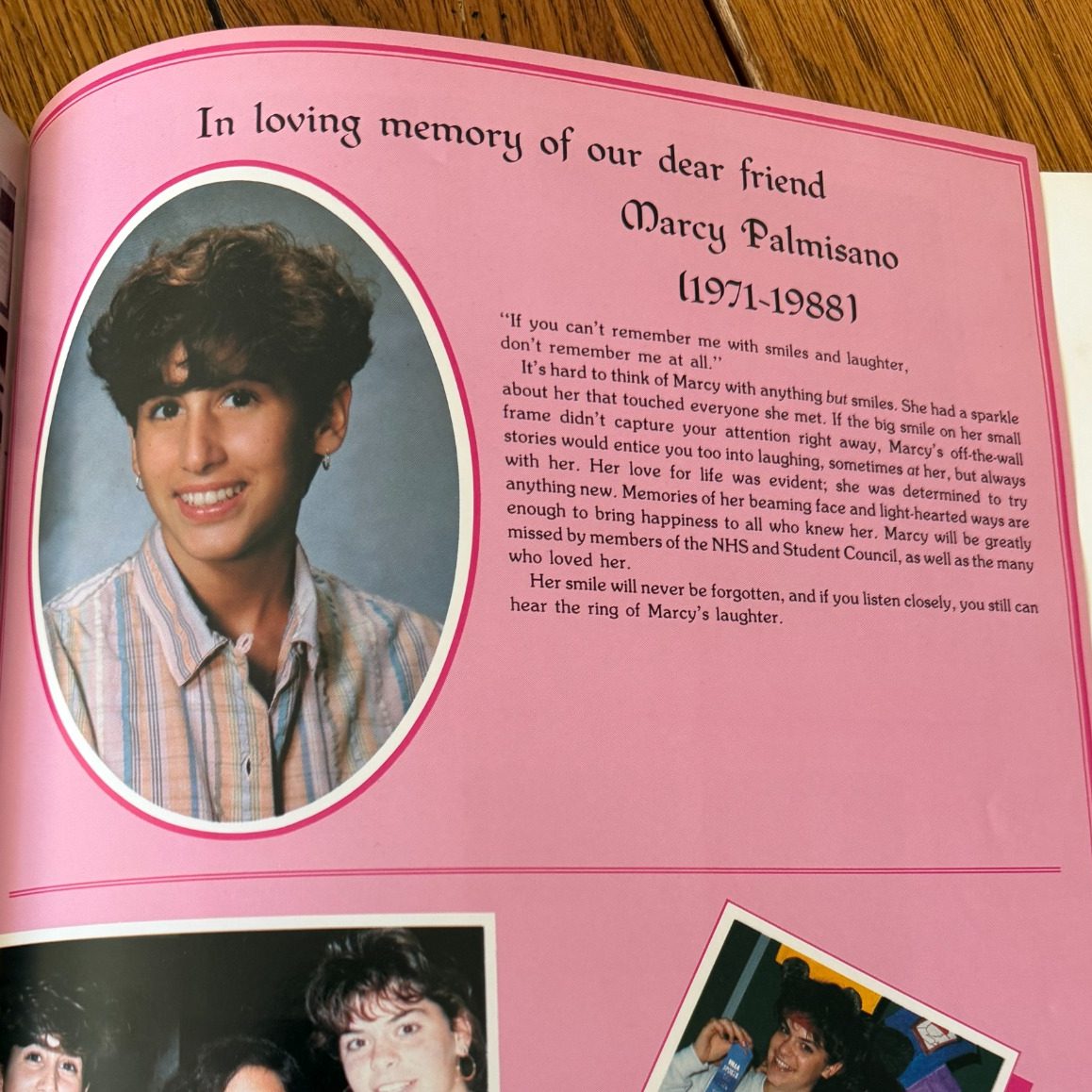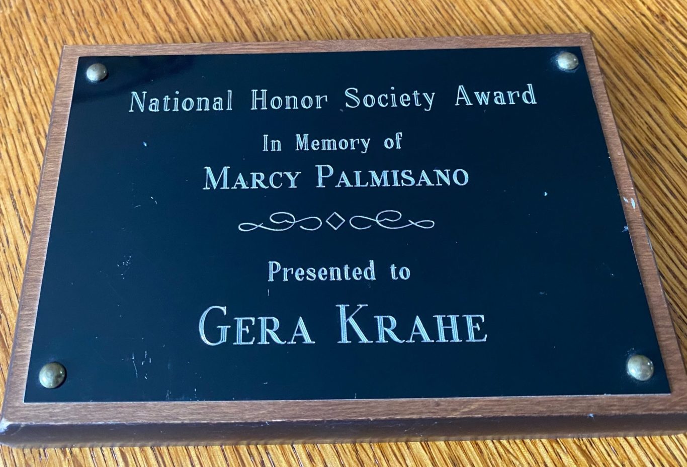 The National Honor Society at VMA instituted this award in Marcy's memory for the student who best exemplified her qualities. I am very humbled to say that I was the first recipient of it. I cannot help but cry every time I see this plaque because of how dear and special Marcy was. She has inspired me to carry on her legacy of sunshine every day since.